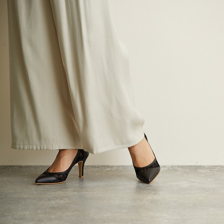 シルエットが美しい7.5㎝ハイヒールパンプス。少し厚みのあるポインテッドトゥが指先に優しい履き心地。チュール使いが女性らしさを演出し、花をモチーフにした柄が足が透けて見え過ぎないようにカモフラージュしています。
