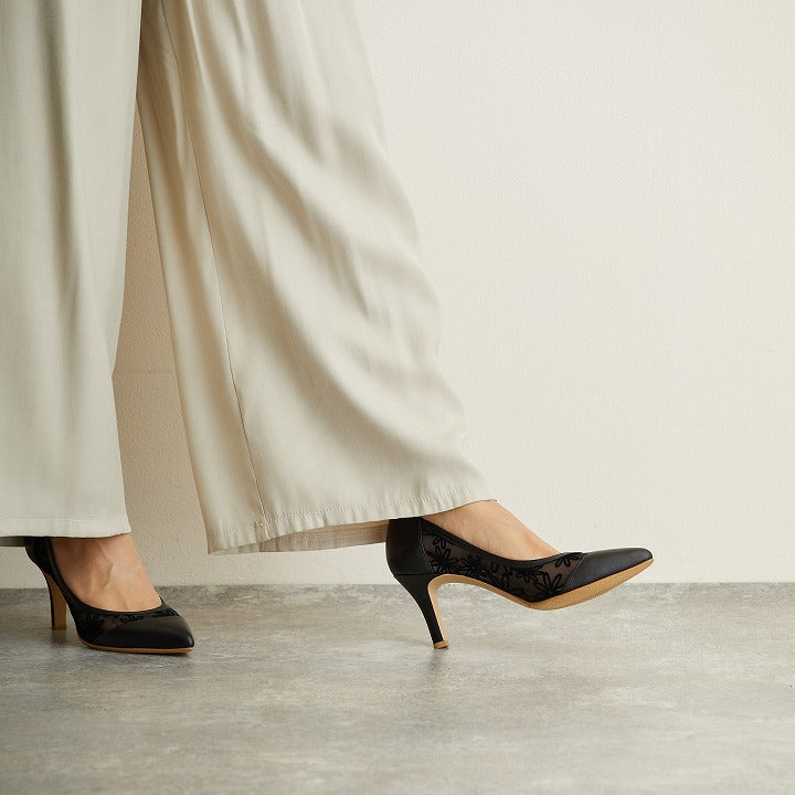 シルエットが美しい7.5㎝ハイヒールパンプス。少し厚みのあるポインテッドトゥが指先に優しい履き心地。チュール使いが女性らしさを演出し、花をモチーフにした柄が足が透けて見え過ぎないようにカモフラージュしています。